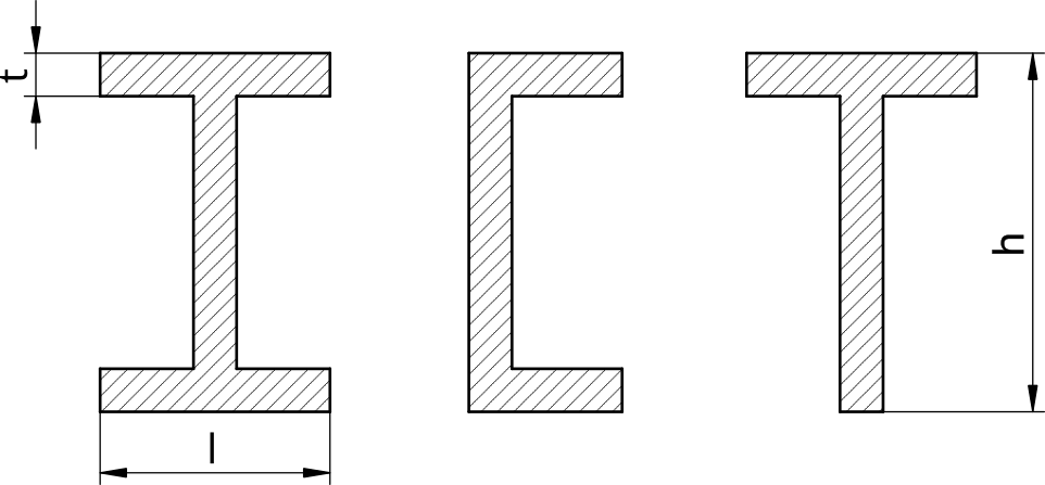 Sunt implementate calculele de rezistență pentru 3 secțiuni: I, T, U; avînd dimensiunile prezentate în fig.2. Este posibilă selecția unui material pentru grindă, pentru calcularea rezistenței maxime.